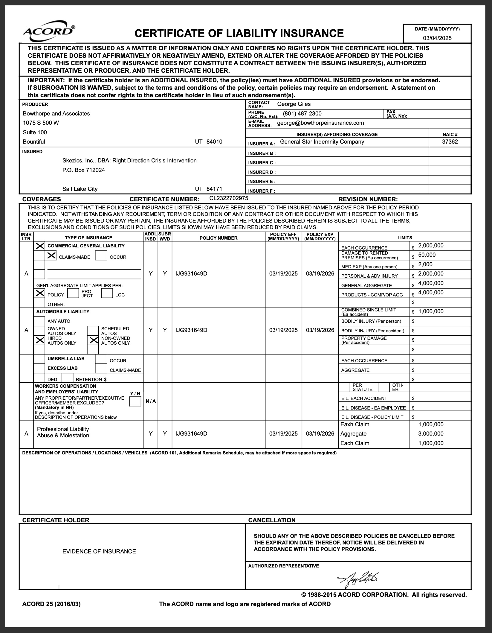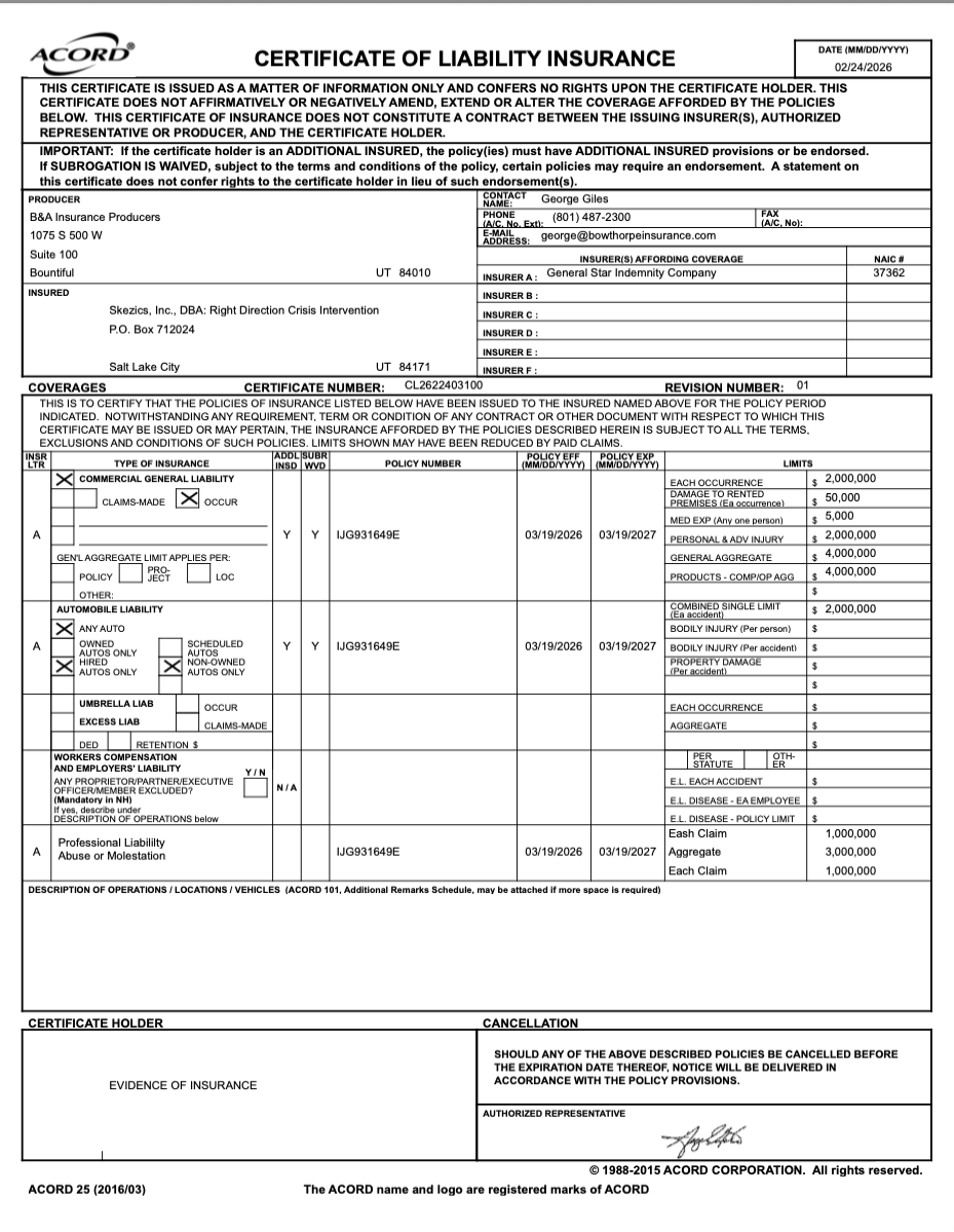 Right Direction’s Professional Liability Insurance, specific to interventions and transport services.